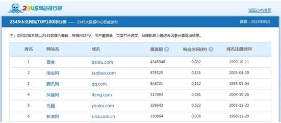此次,2345試水網站排行榜領域,期望能滿足用戶對于互聯網動態的更多需求。在排行榜中,每位用戶均可查看到網站排名、域名、覆蓋量、響應時間及域名注冊時間。如點擊網站名或域名都可直接進入相應網站,這樣可方便網友即時瀏覽和使用喜愛的網站。在TOP100榜單中,隨處可見一些大型的門戶網站和垂直類網站。百度、淘寶和騰訊位列TOP3,而鳳凰網、優酷、新浪、搜狐、新浪微博則緊隨其后。人人、天涯、開心、豆瓣等社交網站和熱門社區也聚集了大量人氣,均取得了不錯的排名。不過,互聯網的動向總是瞬息萬變,各網站的排名也并非一塵不變,2345將實時更新網站排行榜,將最新最全的排行榜呈現在各位用戶的面前。