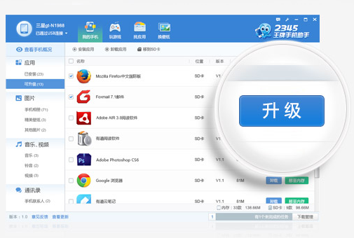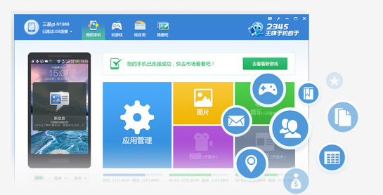 通過數據線的方式將手機連接至PC,便可以通過2345王牌手機助手下載海量應用,游戲、應用軟件一應俱全。還可以通過它進行應用管理、任務管理、短信和聯系人的備份和恢復、圖片視頻音樂等的導入導出等等。