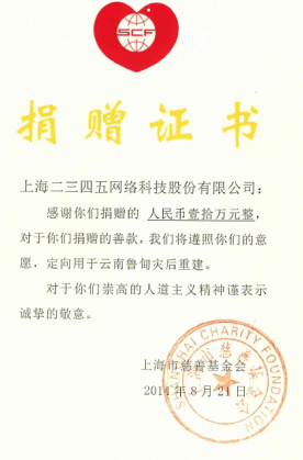 從公司成立之初開始,2345網絡就一直秉承“肩負社會責任,貢獻企業力量”的優良傳統,聯合上海慈善基金會創建2345愛心公益專項基金,積極投身于社會公益事業。不僅多次在國家遭遇災害時貢獻一份力量,也曾多次為病患捐贈善款,還曾捐贈百萬元用于同濟大學等學府的教育事業。從身邊小事到國家大事,2345網絡始終踐行著自身的企業社會責任。相信魯甸震區的民眾也會在這份愛中感受到來自遠方的關懷與溫暖。