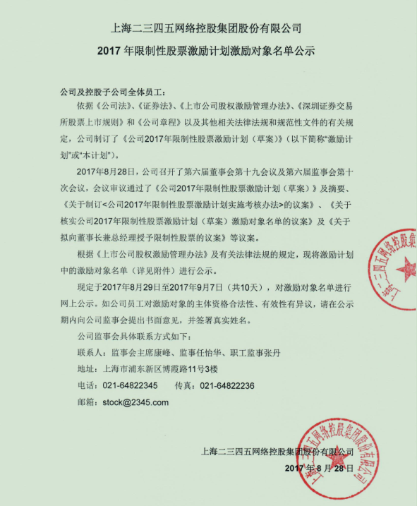 現(xiàn)定于2017年8月29日至2017年9月7日(共10天),對激勵對象名單進行網(wǎng)上公示。如公司員工對激勵對象的主體資格合法性、有效性有異議,請在公示期內(nèi)向公司監(jiān)事會提出書面意見,并簽署真實姓名。