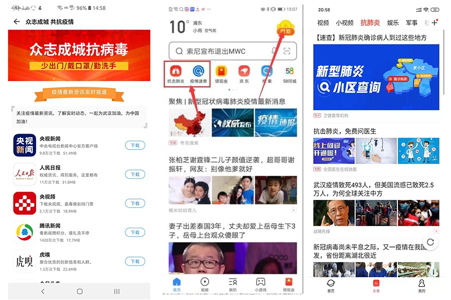 作為國內社交巨頭之一,字節跳動在今日頭條上線“抗擊肺炎”頻道,抖音則上線“抗擊肺炎疫情”專題頁面,用戶搜索“肺炎”等關鍵詞即可進入。