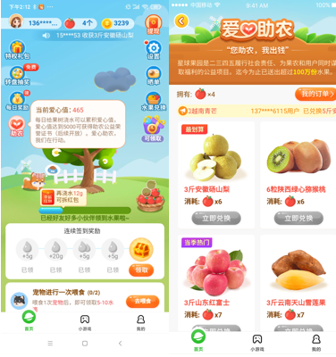 以最受用戶歡迎的核心助農游戲產品 “星球果園”為例,“星球果園”是一款典型的虛擬農場產品,用戶通過在產品頁面種下樹苗后,完成平臺制定的相應“小任務”,如每天簽到、給寵物喂食、瀏覽指定頁面、看新聞、看視頻等方式,即可獲得不等量的水滴獎勵,并用水滴澆灌樹苗,使其成長為果樹,完成任務后最終可免費兌換實物水果,平臺包郵送到家。